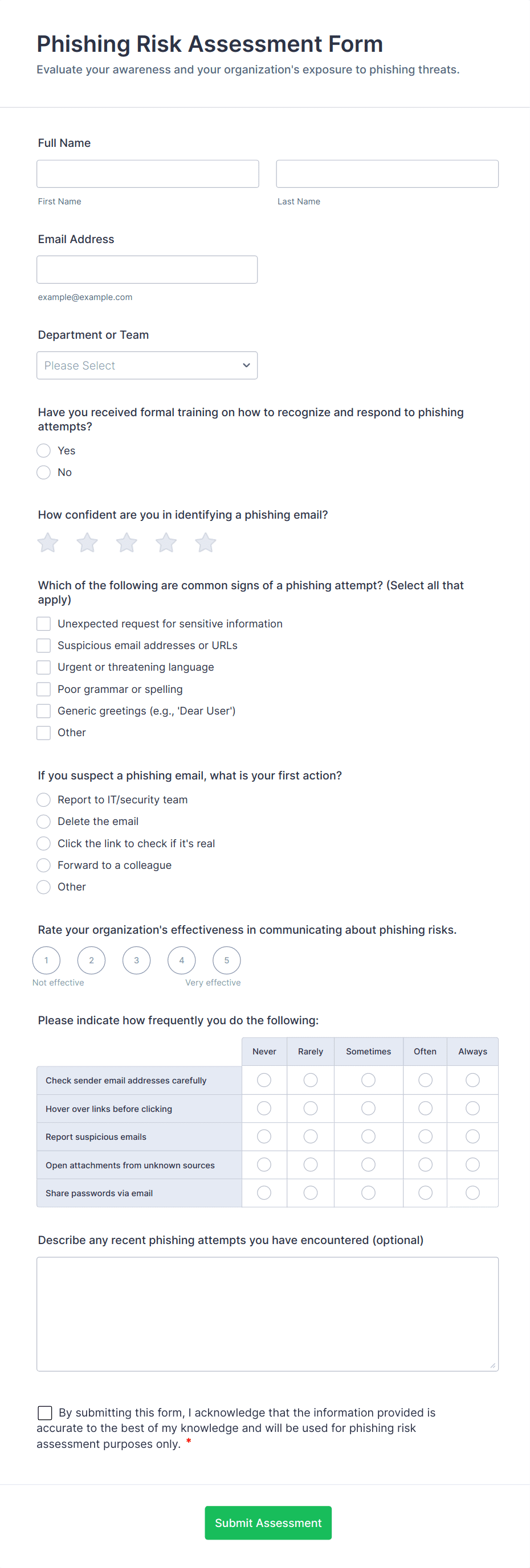 The form templates here are for informational purposes only. Jotform is not providing legal, financial, or other advice, or implying that the forms are legally valid in all or any jurisdictions. Before using any such form, consult an attorney and/or other applicable professionals to make sure that the form meets your needs, legally and otherwise.