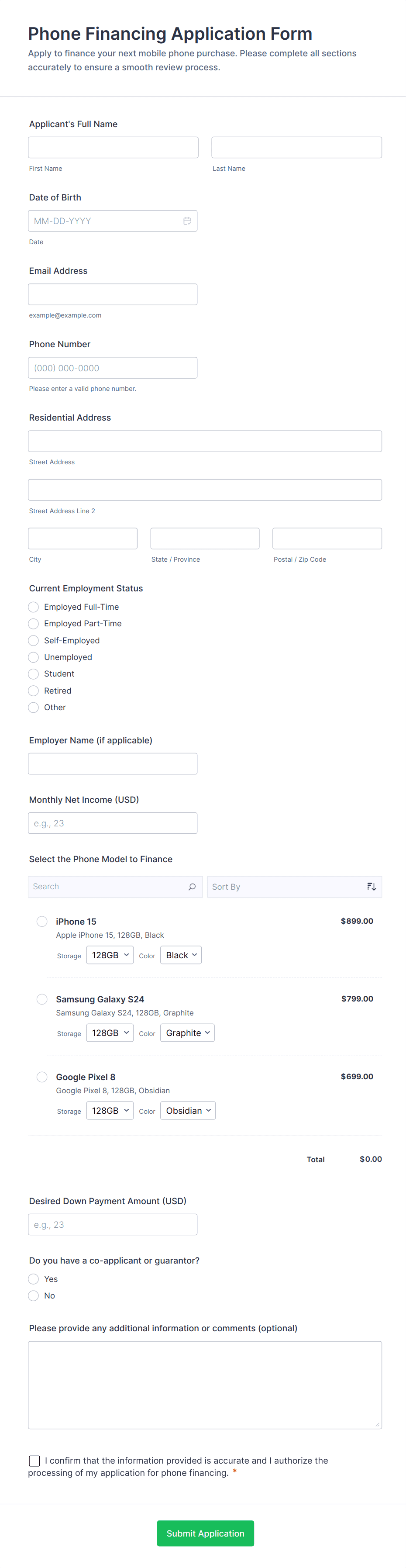 - File upload fields for supporting documents (e.g., pay stubs, tax returns, business plans)