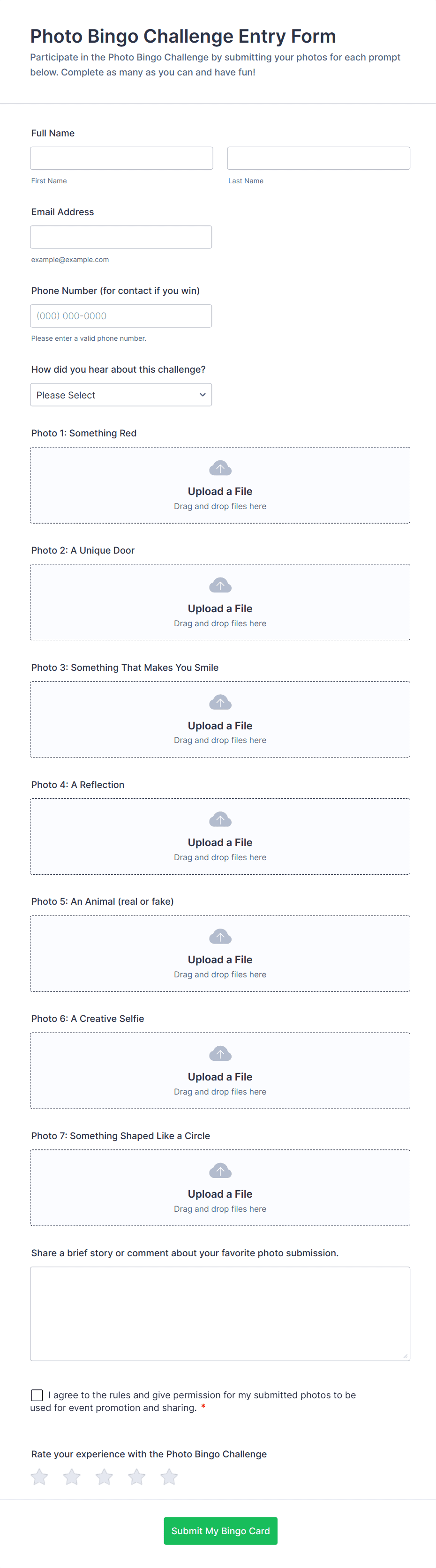 • File upload fields for photo, video, or document submissions.