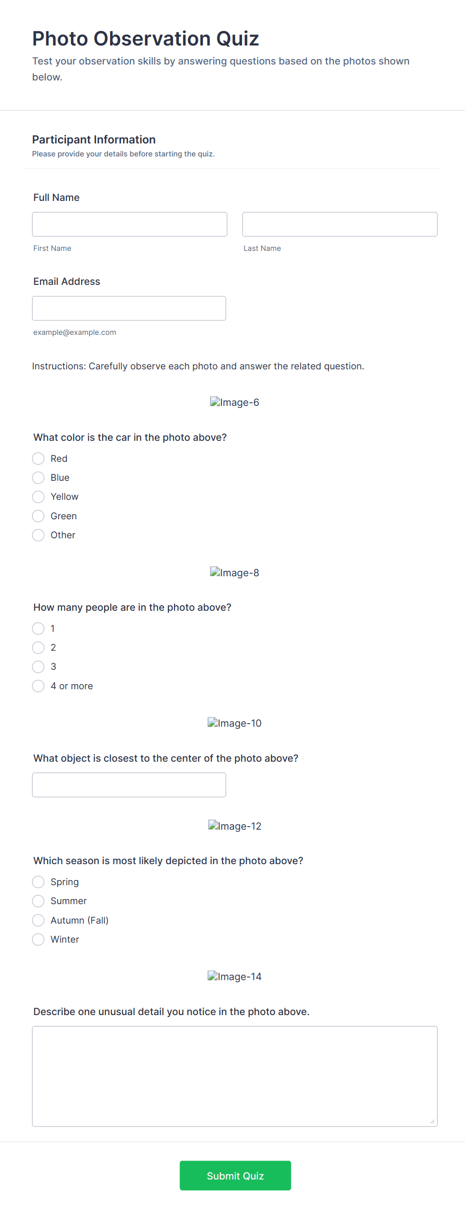 Quiz Templates are pre-designed forms specifically created to facilitate the process of building quizzes for a variety of purposes, such as education, employee training, lead generation, event engagement, and more. These templates provide a structured way to present questions, collect answers, and automatically score or evaluate responses. Whether you’re a teacher assessing student knowledge, a business running a product knowledge test, or a marketer creating a fun personality quiz, Quiz Templates offer a flexible foundation to suit your needs. They can be used for online exams, trivia games, onboarding assessments, customer feedback quizzes, and interactive learning modules.