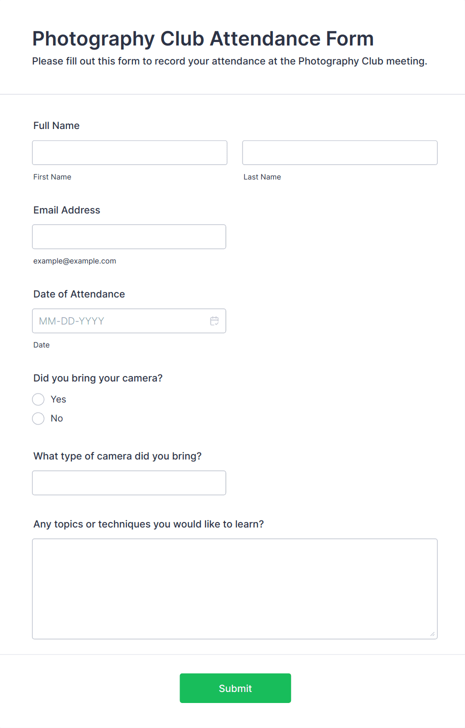 • Workshops and training sessions: Register participants, gather skill levels, and manage waitlists.