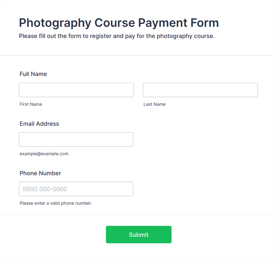 Collect client information, payments, and legally binding signatures with a free photography contract that presents your terms and conditions. Integrate your online photography contract with a payment gateway and collect online payments from clients.