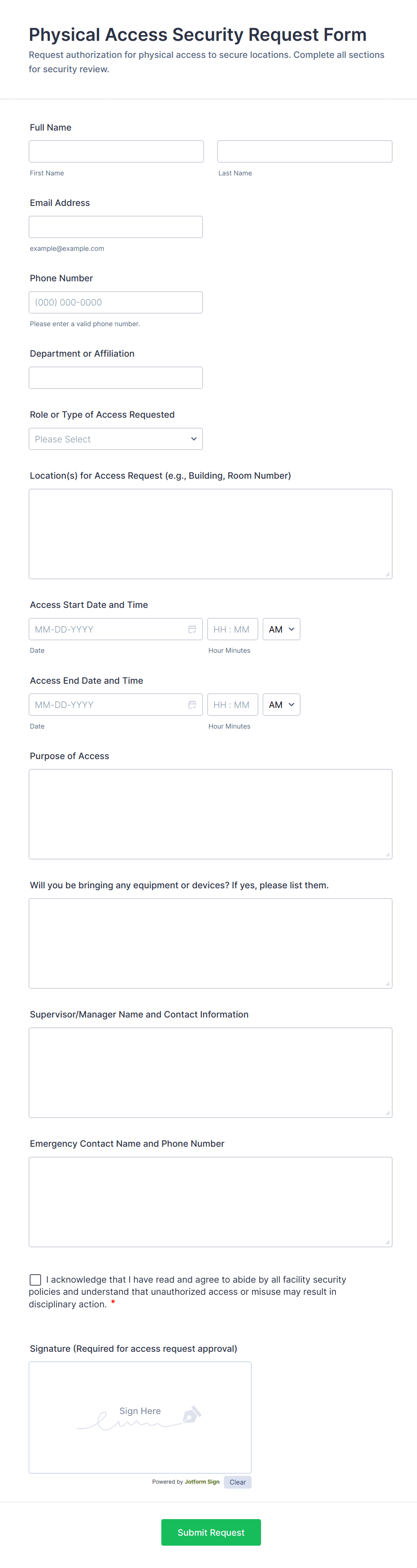 Access control forms are structured documents used to request, approve, and document access to physical locations, systems, or restricted resources. They help organizations manage who can enter certain areas, use specific equipment, or access sensitive digital systems by collecting consistent details such as requester identity, access level, justification, and approval records. Access control forms are commonly used in offices, campuses, data centers, hospitals, warehouses, and IT environments for badge requests, visitor access, temporary passes, role-based system access, and permission changes. By standardizing access requests, these forms reduce security risks, improve accountability, and create clear audit trails.