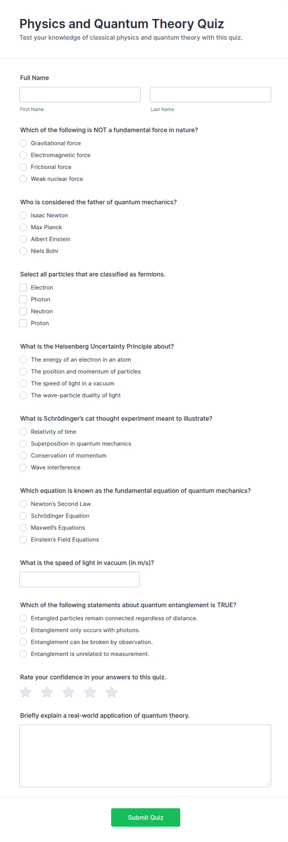 Quiz Templates are pre-designed forms specifically created to facilitate the process of building quizzes for a variety of purposes, such as education, employee training, lead generation, event engagement, and more. These templates provide a structured way to present questions, collect answers, and automatically score or evaluate responses. Whether you’re a teacher assessing student knowledge, a business running a product knowledge test, or a marketer creating a fun personality quiz, Quiz Templates offer a flexible foundation to suit your needs. They can be used for online exams, trivia games, onboarding assessments, customer feedback quizzes, and interactive learning modules.
