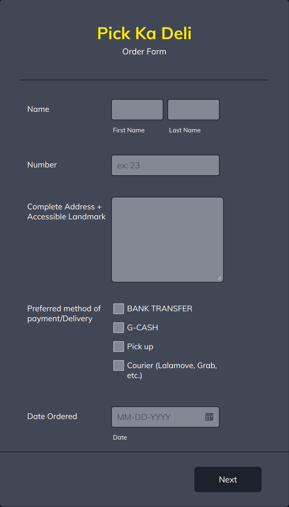 Typical fields include customer name, contact information, product selection, quantity, payment details, and shipping address (if applicable).