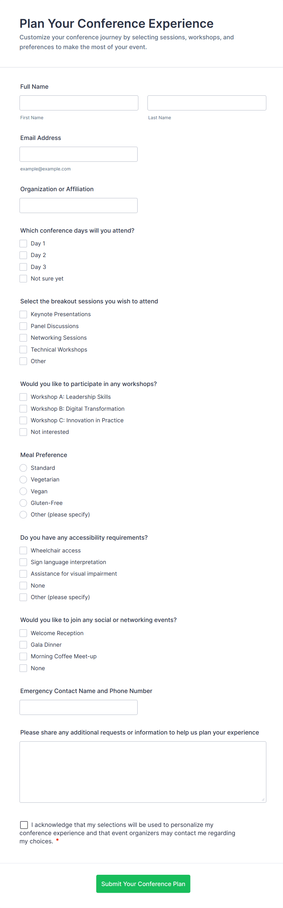 - Session or Workshop Selection (dropdowns or checkboxes)