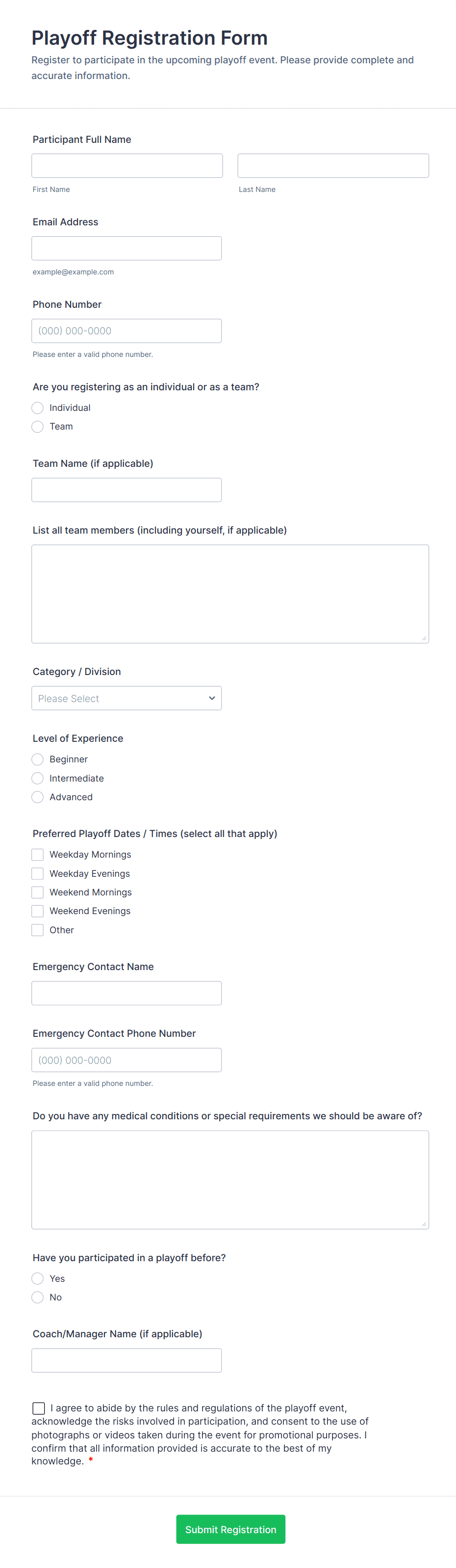 Sports Registration Forms can be adapted for a wide variety of athletic events and organizations, each with unique requirements and challenges. Here’s how these forms address different needs and scenarios: