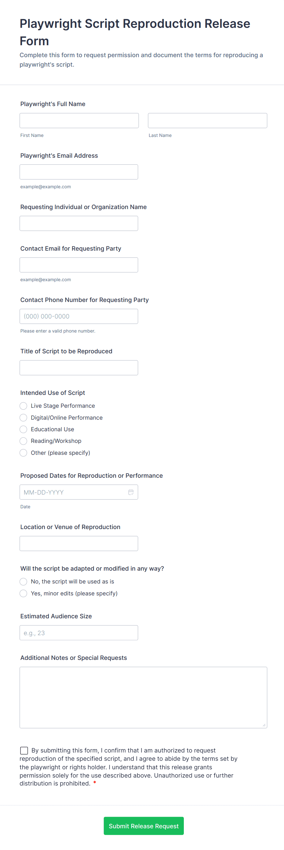 - For specialized releases, include conditional logic to show or hide fields based on user responses (e.g., show parent fields if the participant is under 18).