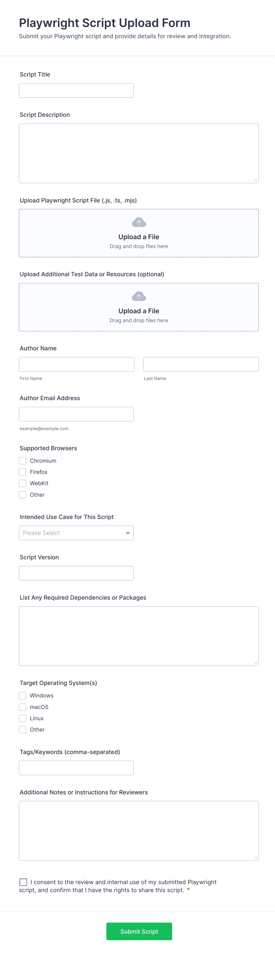 • Support Request Forms: Combine file upload with detailed problem description fields and contact information.