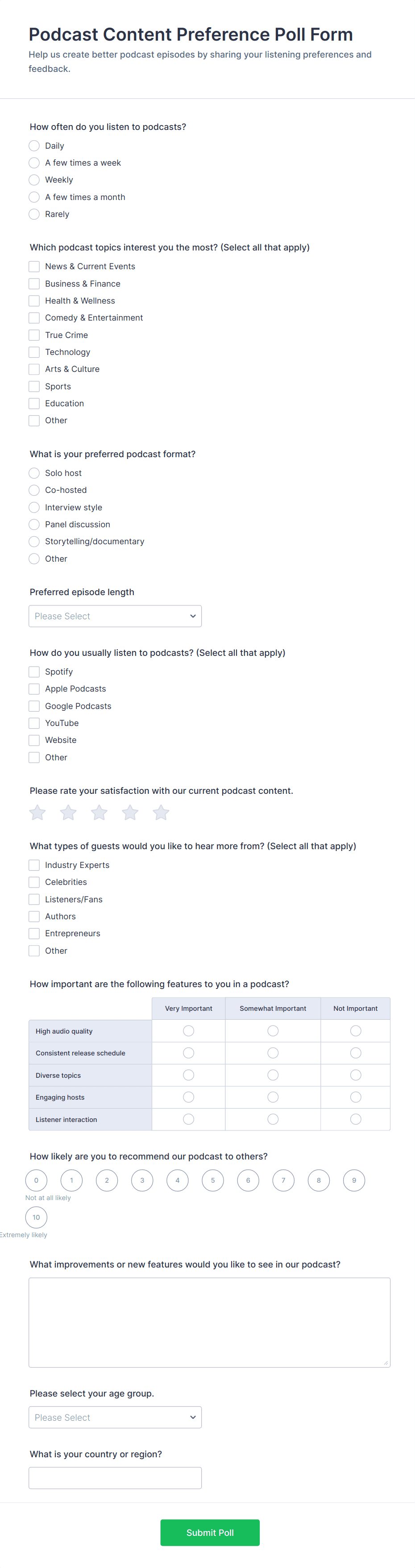 • Content and fields vary by use case: customer polls may focus on satisfaction scales and open-ended feedback, while event polls might use date pickers and multiple-choice questions.