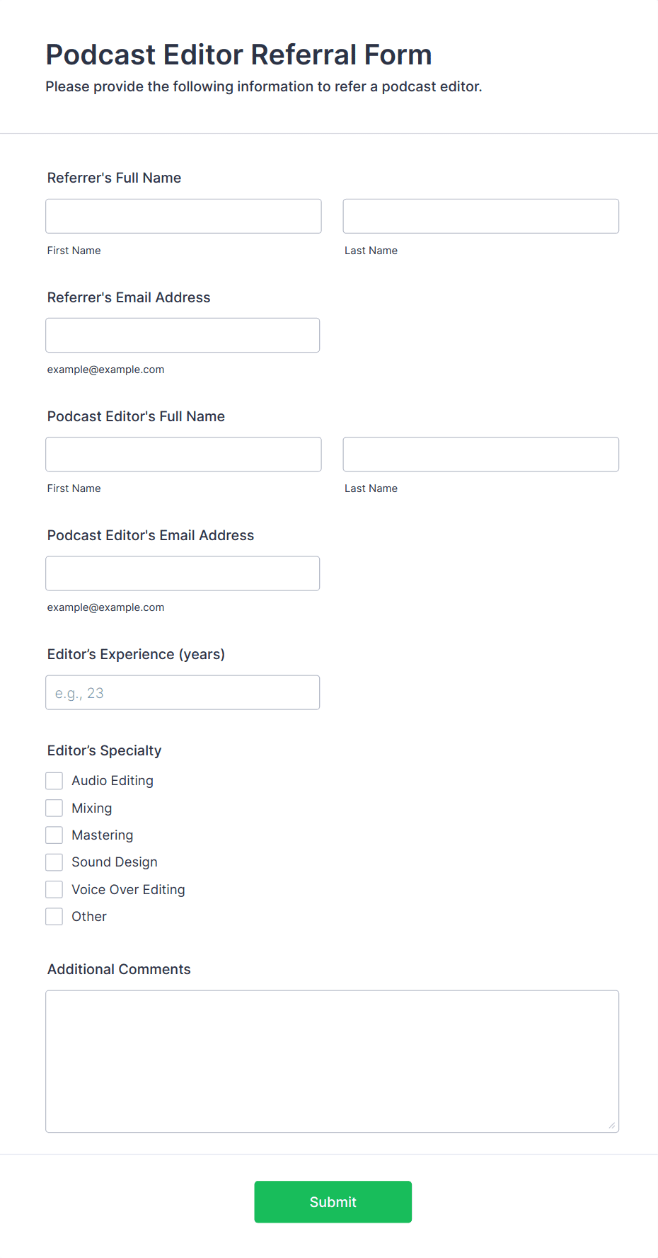 • Service Provider Referrals: Legal, financial, or consulting firms use referral forms to recommend trusted partners or specialists to clients. These forms might request case details, urgency, and specific expertise needed.