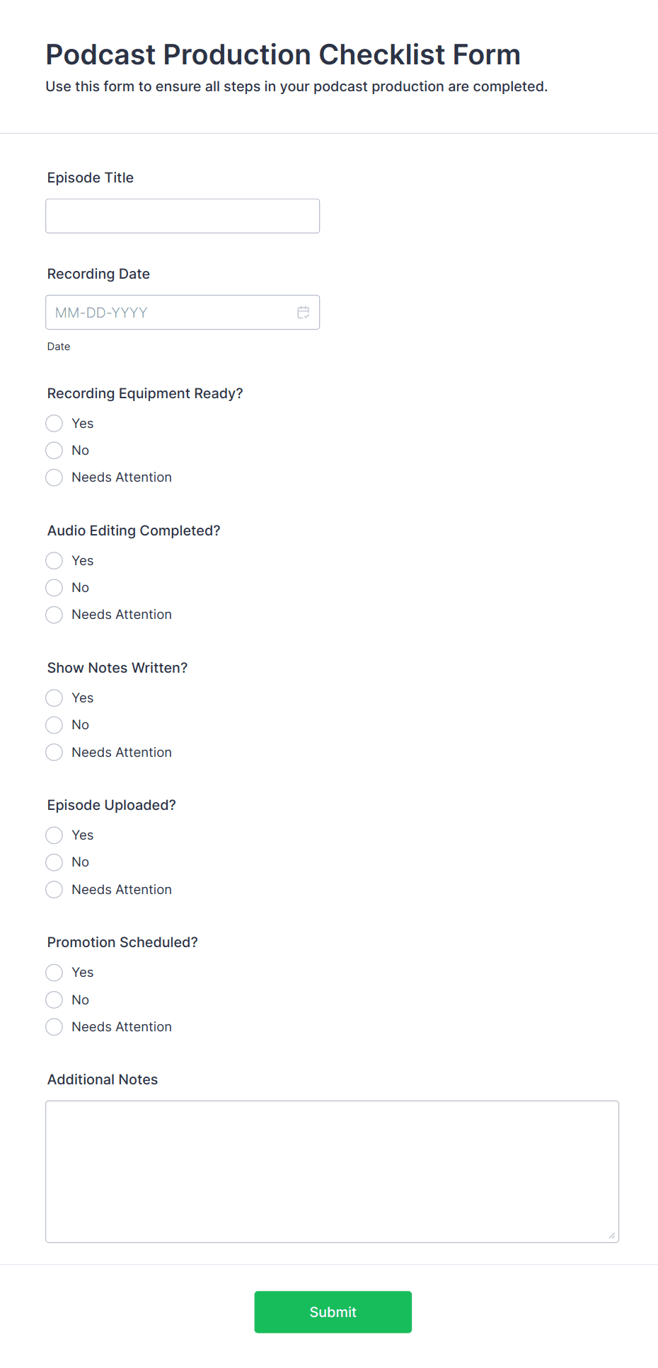 - For more complex checklists, add dropdowns, file upload fields (for attaching evidence or reports), or signature fields (for verification).