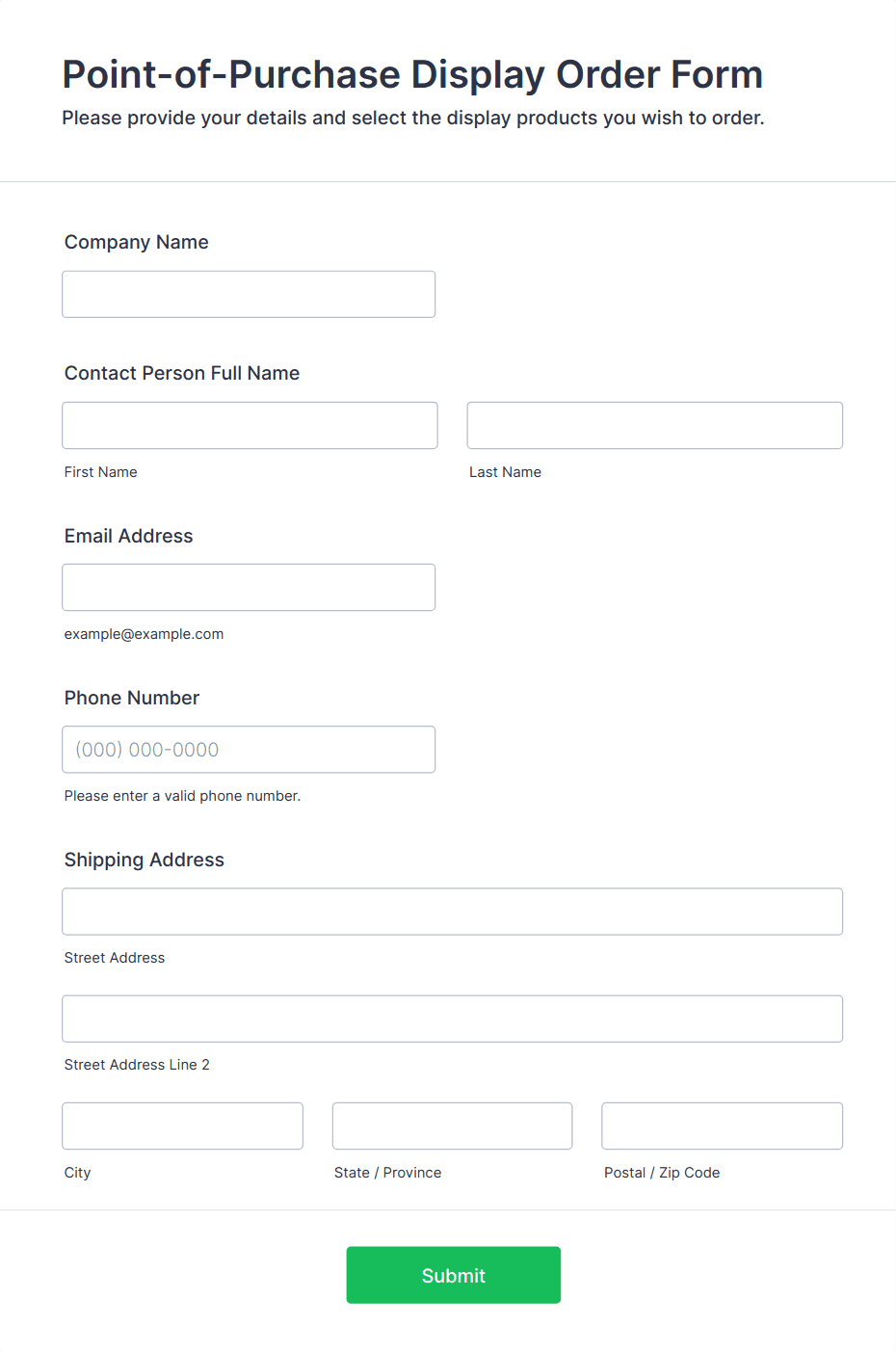 Typical fields include customer name, contact information, product selection, quantity, payment details, and shipping address (if applicable).