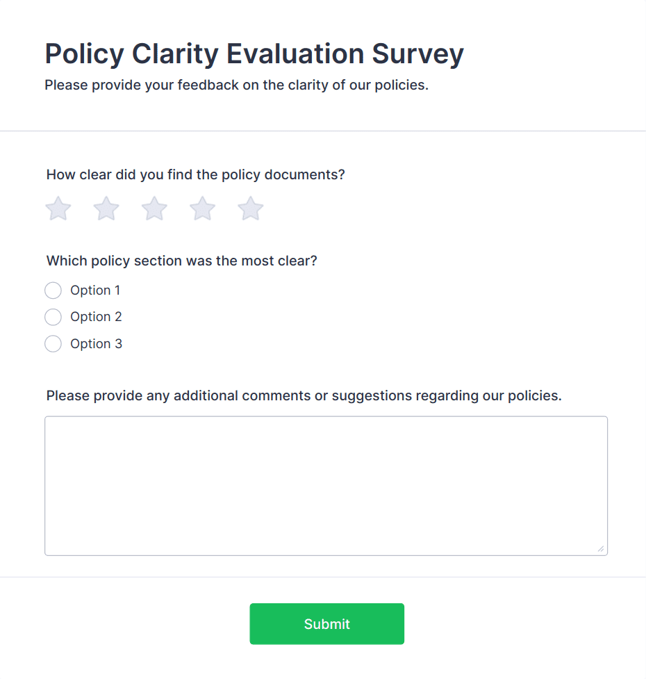 Evaluation surveys are structured tools designed to gather feedback, measure satisfaction, and assess the effectiveness of programs, services, events, or products. They are widely used across various industries and sectors, including education, healthcare, business, and nonprofit organizations, to collect valuable insights from participants, clients, employees, or stakeholders. Common use cases include course evaluations, employee performance reviews, event feedback, customer satisfaction assessments, and program impact studies. By systematically collecting and analyzing responses, organizations can identify strengths, uncover areas for improvement, and make informed decisions to enhance their offerings.