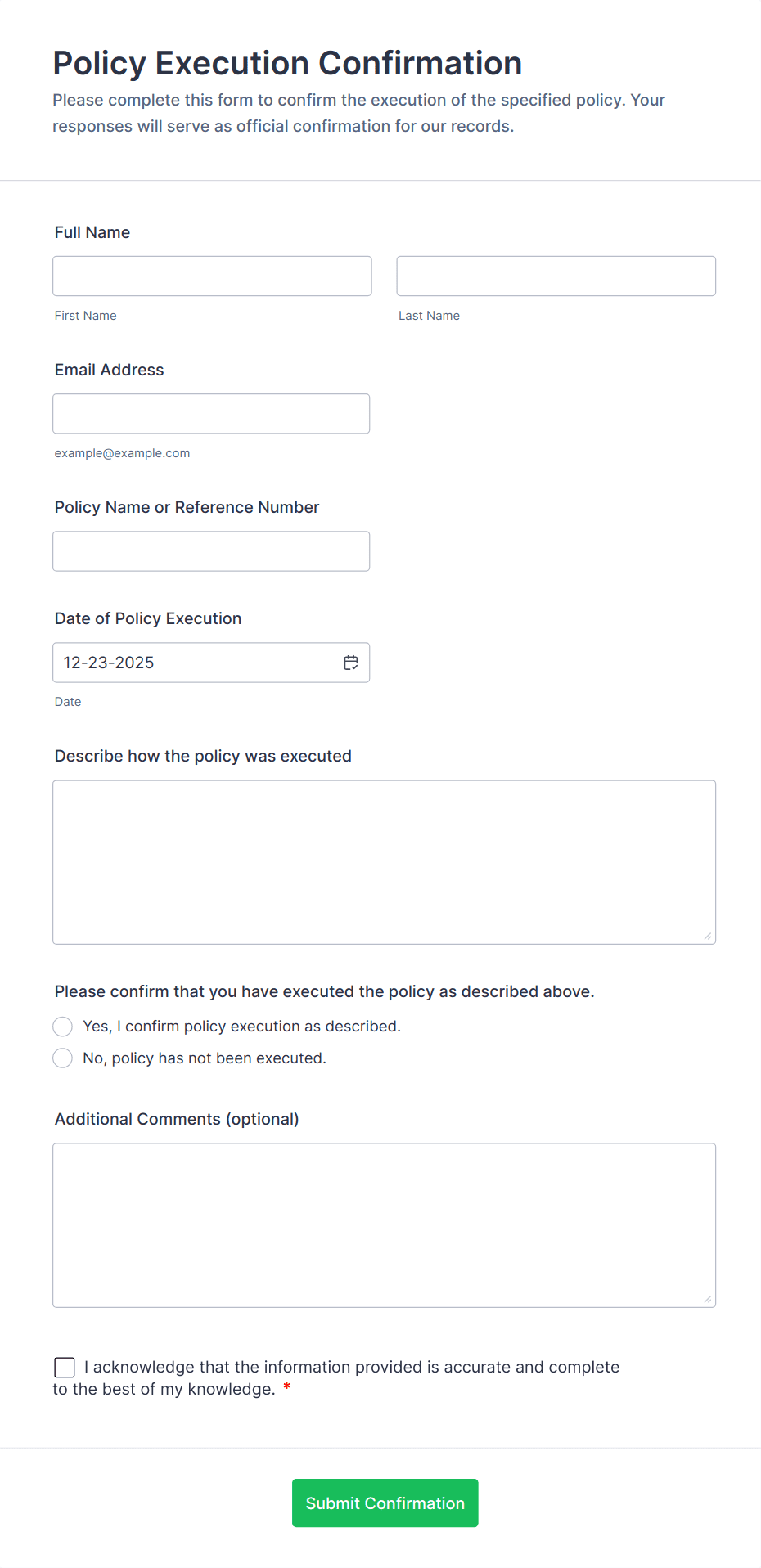 The form templates here are for informational purposes only. Jotform is not providing legal, financial, or other advice, or implying that the forms are legally valid in all or any jurisdictions. Before using any such form, consult an attorney and/or other applicable professionals to make sure that the form meets your needs, legally and otherwise.
