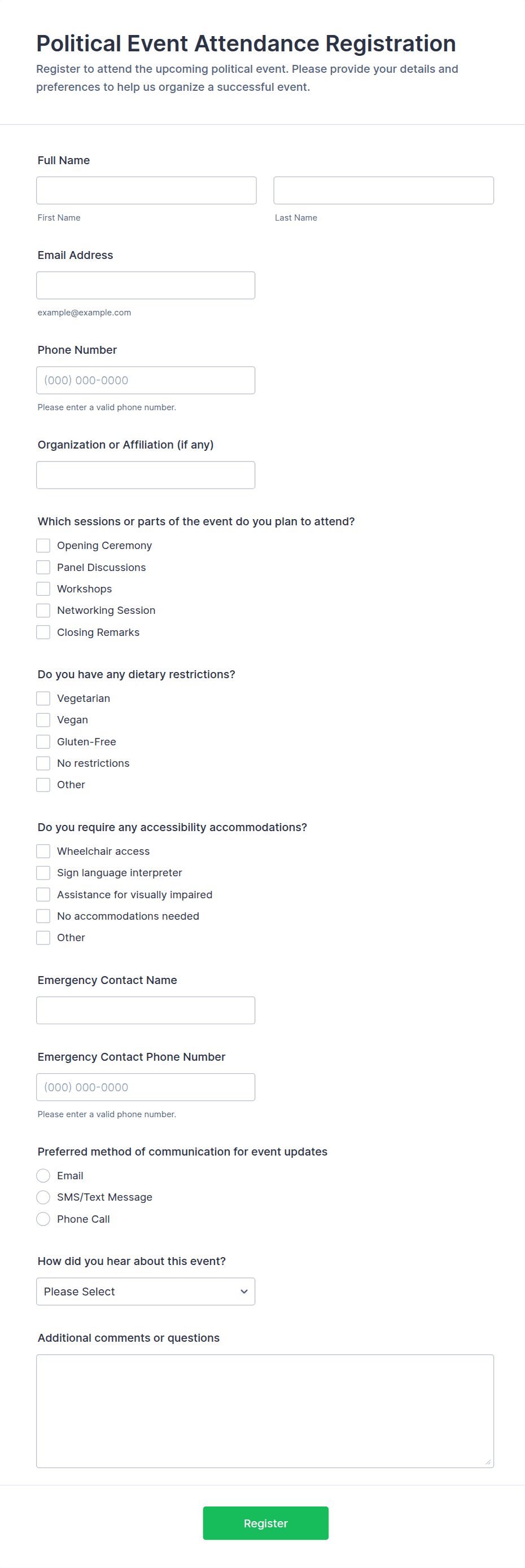 • Content and fields vary based on event type: For example, a conference form may include session selection and company details, while a wedding RSVP form might ask for meal preferences and plus-one information.
