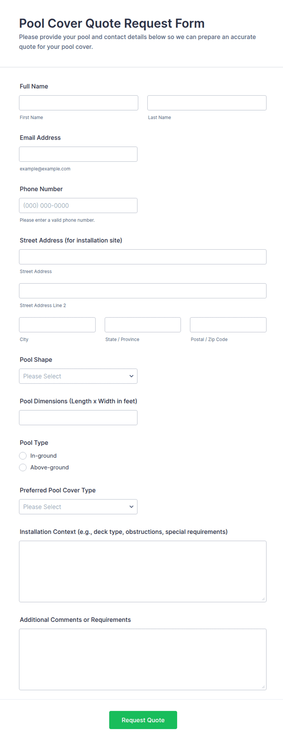 Quote forms are specialized online forms designed to collect information from customers or clients seeking a price estimate for products or services. These forms are commonly used by businesses in industries such as insurance, construction, event planning, logistics, and professional services, where pricing can vary based on specific requirements. By gathering essential details—such as project scope, service preferences, quantities, and contact information—quote forms enable businesses to provide accurate, tailored quotes efficiently. They streamline the initial inquiry process, reduce back-and-forth communication, and help both parties set clear expectations from the outset.