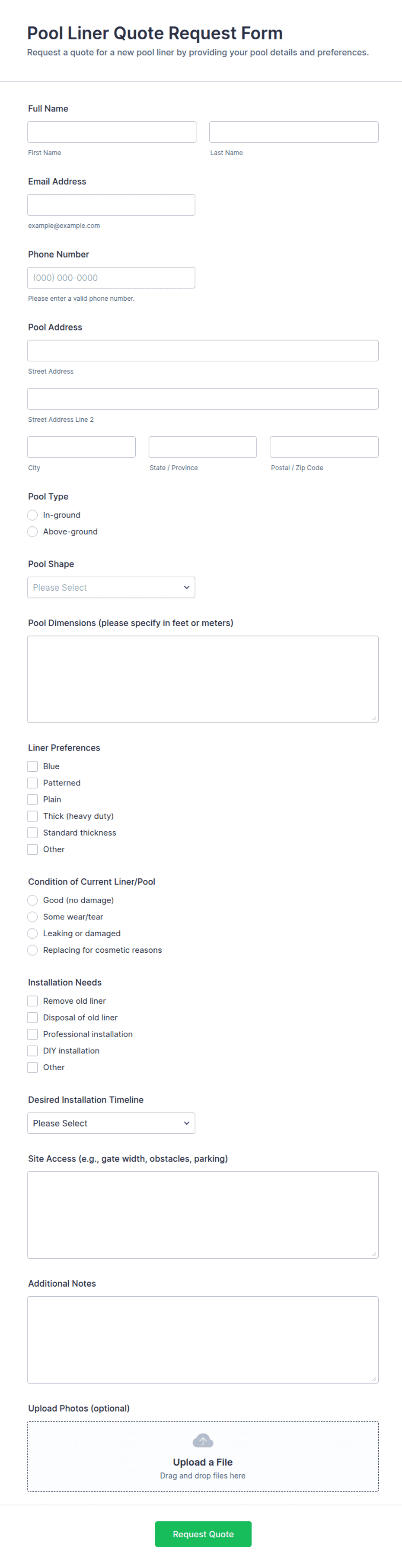 Typical fields include contact details, service or product selection, quantity, project specifications, preferred dates, and any additional requirements relevant to the quote.