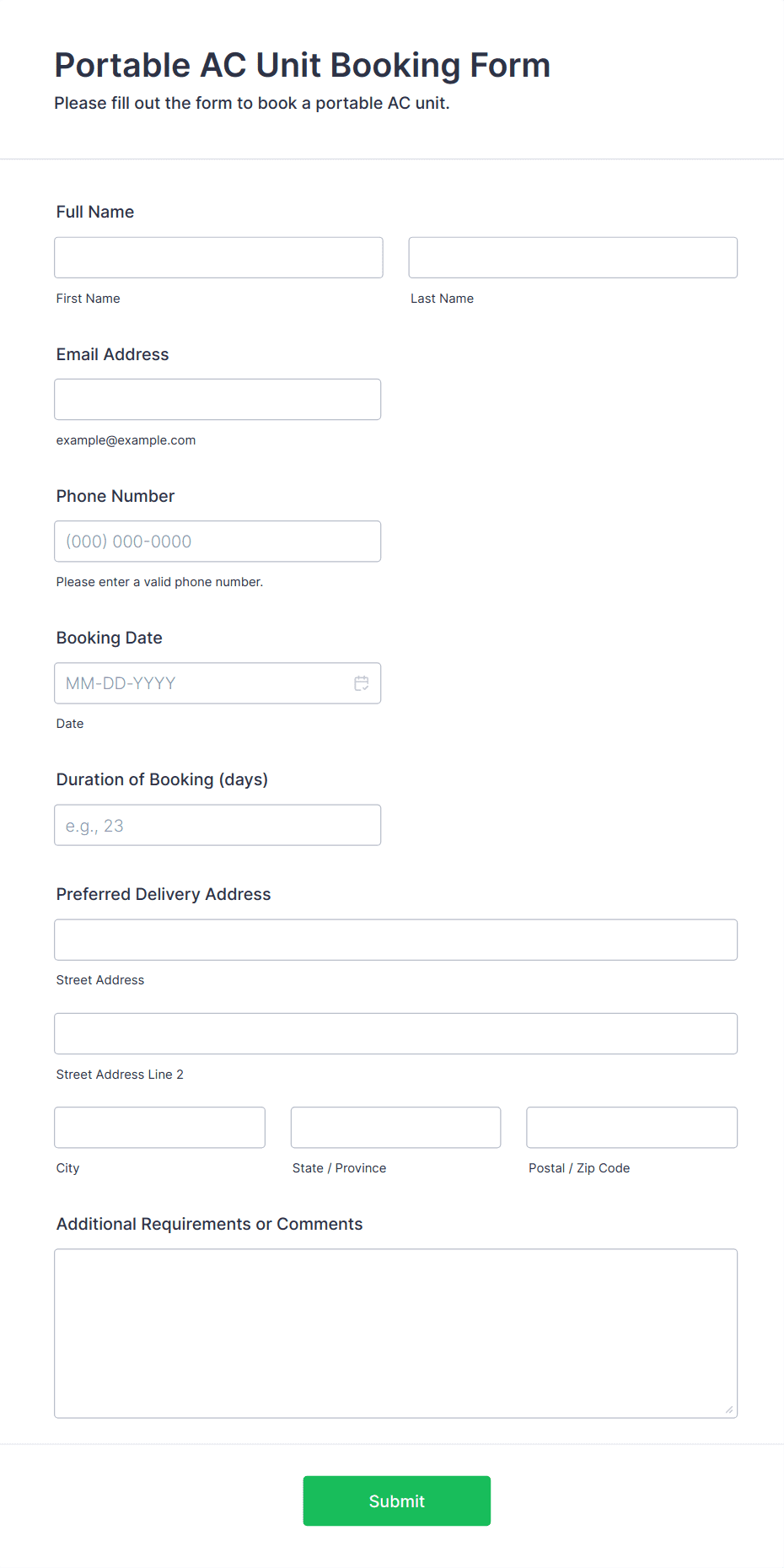 Booking forms are digital tools designed to streamline the process of scheduling appointments, reserving services, or booking resources. They are commonly used across a variety of industries, including hospitality, healthcare, education, event management, and personal services. Whether you’re managing hotel room reservations, client appointments, event registrations, or equipment rentals, booking forms help automate the intake of essential information, reduce manual errors, and ensure a smooth experience for both service providers and customers. Typical use cases include booking consultations, reserving meeting rooms, scheduling classes, or securing tickets for events.