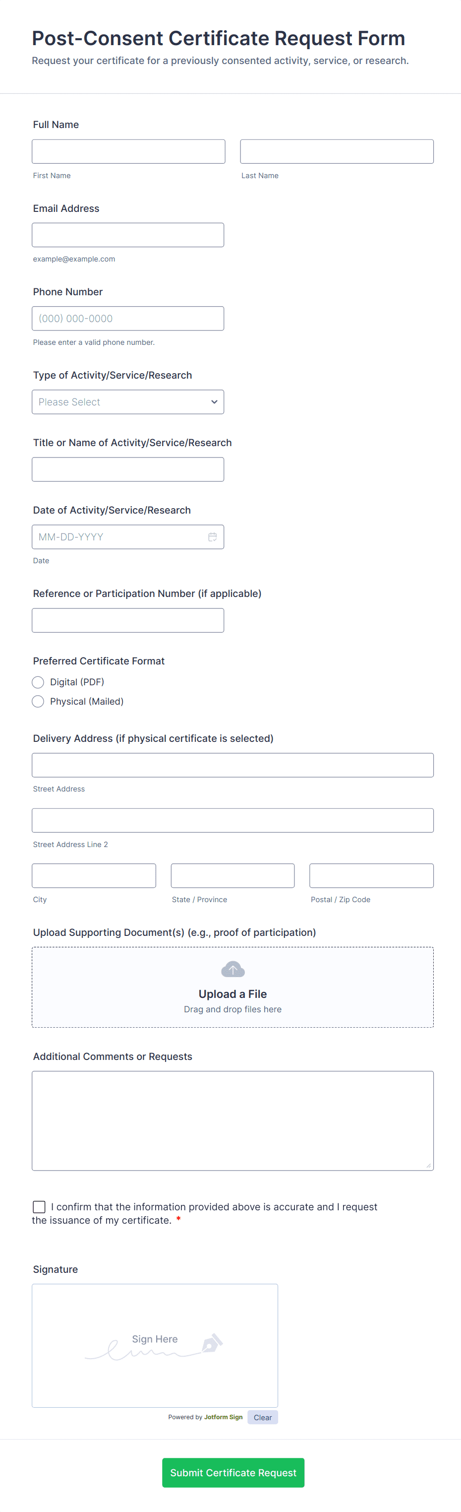 The form templates here are for informational purposes only. Jotform is not providing legal, financial, or other advice, or implying that the forms are legally valid in all or any jurisdictions. Before using any such form, consult an attorney and/or other applicable professionals to make sure that the form meets your needs, legally and otherwise.