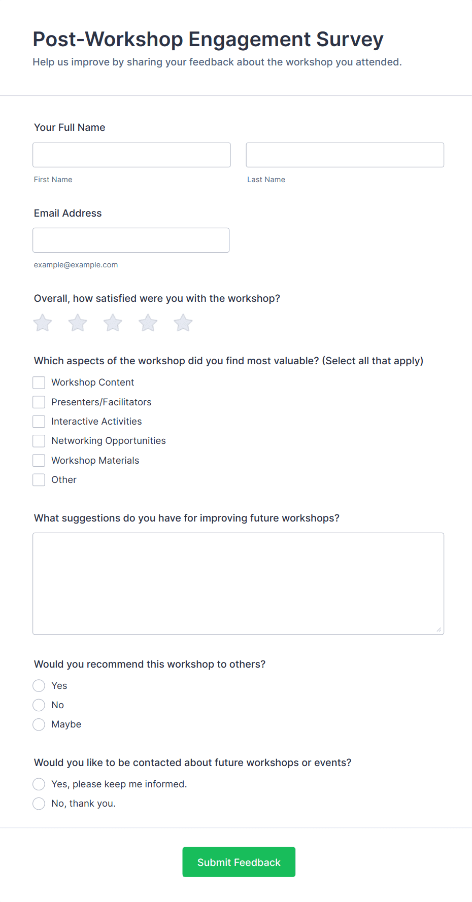 A Virtual Workshop Feedback Form is a customer survey that is used by the organizers of Virtual Workshops to gather feedback from those who attended.