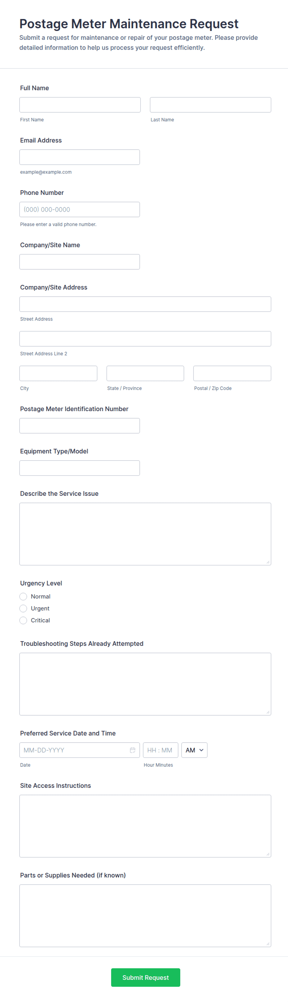 • Equipment maintenance request forms focus on equipment ID, issue description, severity, impact on operations, and preferred service timing.