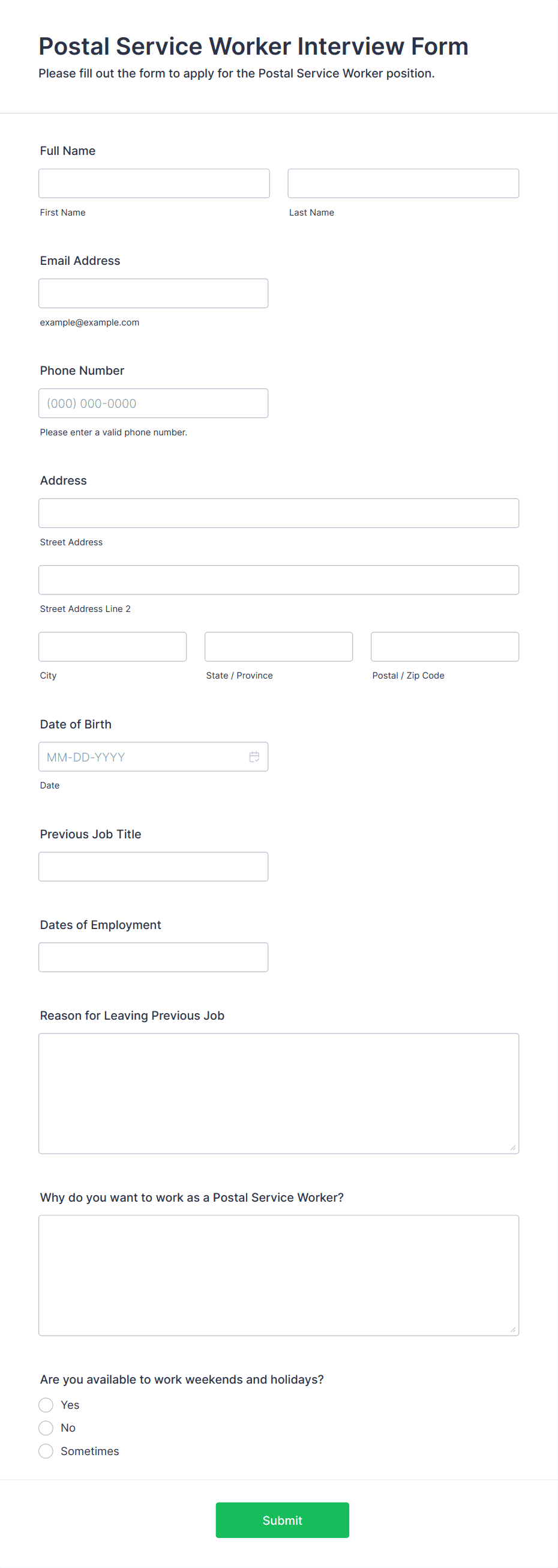 Interview forms are specialized documents or digital tools designed to streamline the process of gathering information from candidates, clients, or stakeholders during interviews. These forms can be used in a variety of settings, such as job interviews, academic research, client intake sessions, or even exit interviews. By standardizing the questions and response formats, interview forms help ensure consistency, fairness, and efficiency in the data collection process. They can include a mix of question types, such as multiple choice, open-ended, rating scales, and more, tailored to the specific goals of the interview.