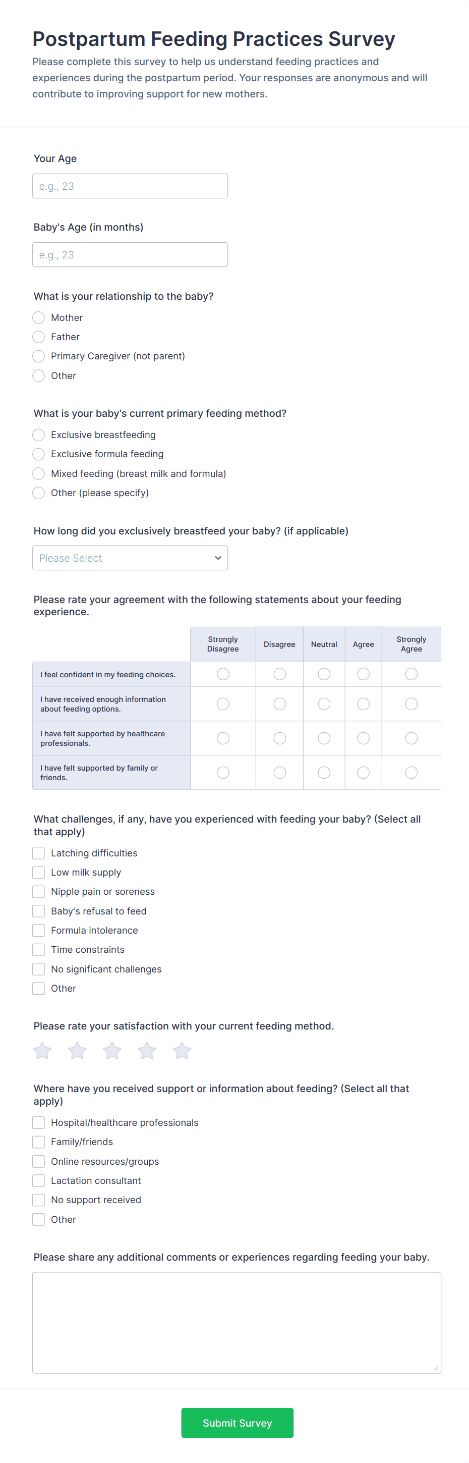 Medical surveys and questionnaires are essential tools used by healthcare professionals, researchers, clinics, and organizations to collect valuable information about patients’ health, medical histories, symptoms, treatment outcomes, and overall well-being. These forms can be used for a variety of purposes, such as patient intake, health risk assessments, satisfaction surveys, mental health screenings, post-visit feedback, and clinical research studies. By gathering structured data directly from patients or study participants, medical surveys and questionnaires help streamline workflows, improve patient care, and support evidence-based decision-making in healthcare settings.