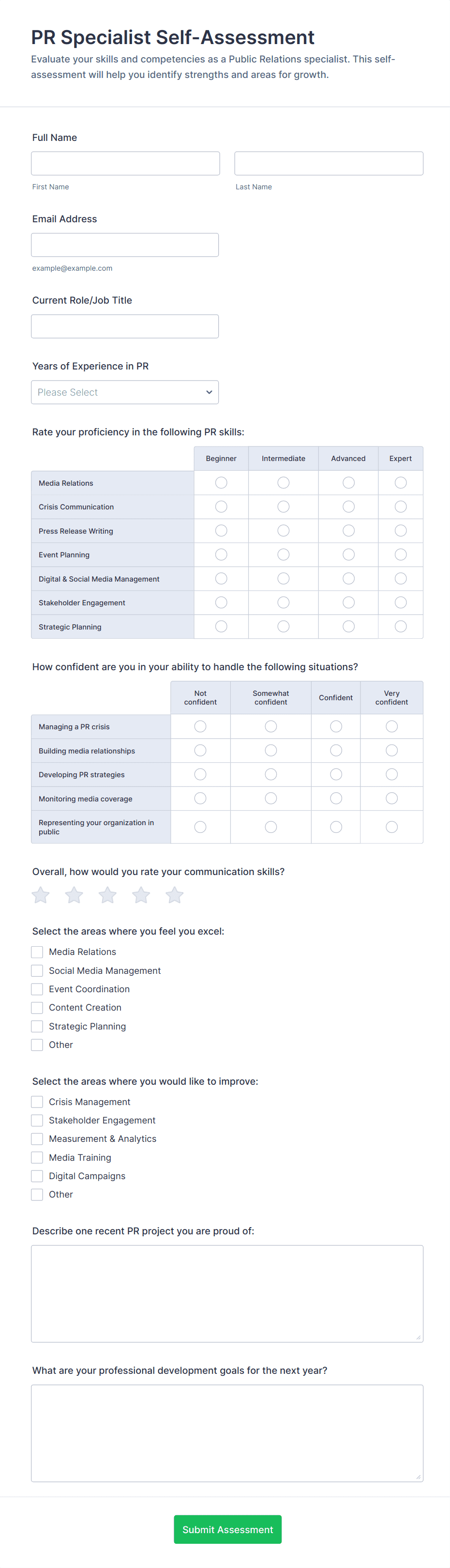 An assessment form is a questionnaire used to make assessments with all necessary metrics included. Go online with no coding!