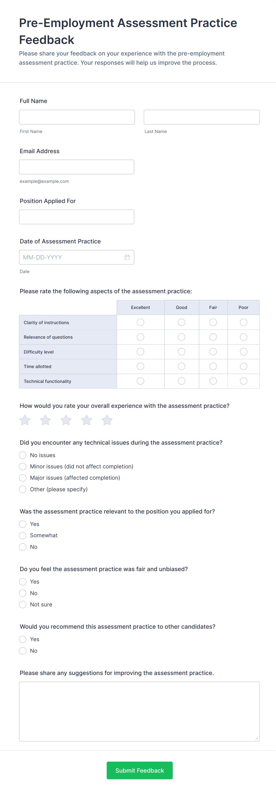 Assessment forms may include personal details, multiple-choice or open-ended questions, rating scales, comment sections, and sometimes automated scoring or feedback fields, depending on the purpose.