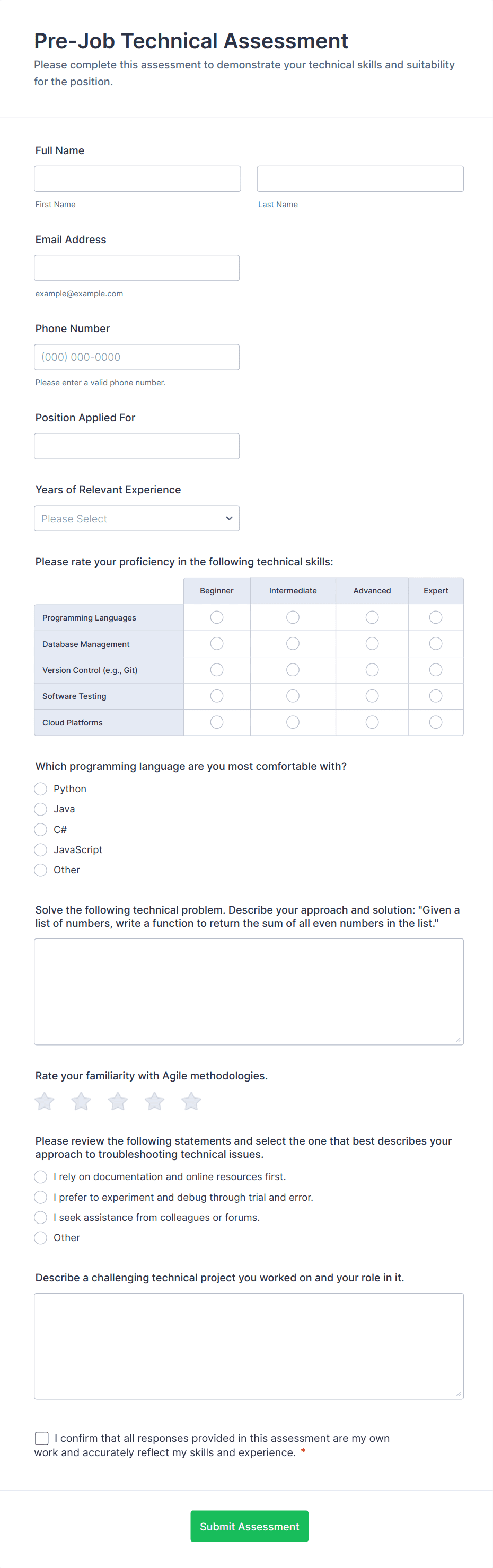 Assessment forms may include personal details, multiple-choice or open-ended questions, rating scales, comment sections, and sometimes automated scoring or feedback fields, depending on the purpose.