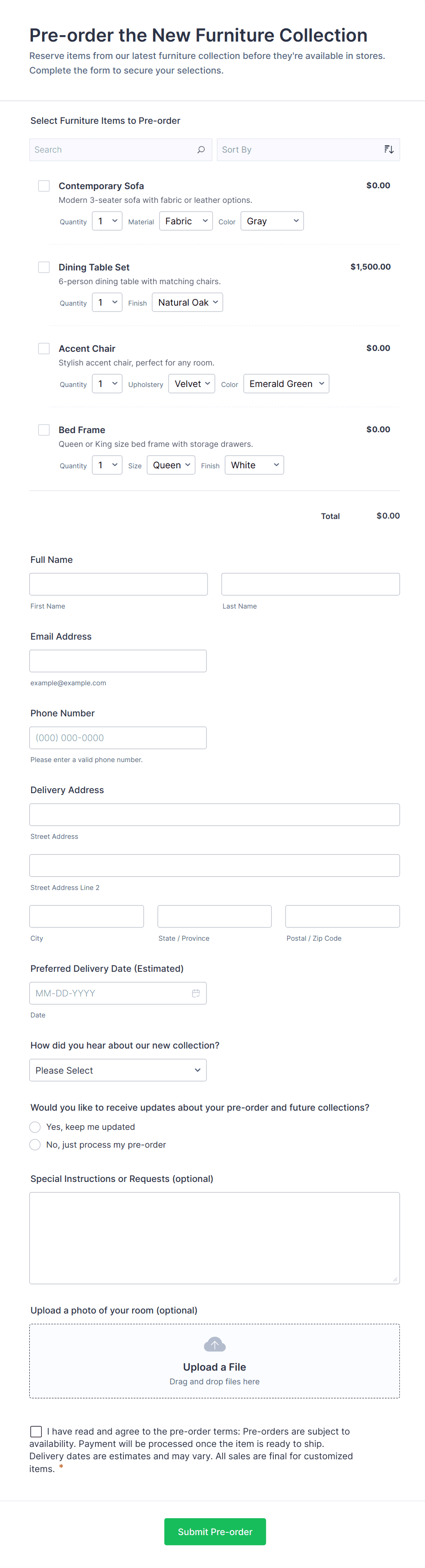 Embed a free Pre-Order Form Template in your store’s website to instantly process product pre-orders online. Free to use, easy to customize!