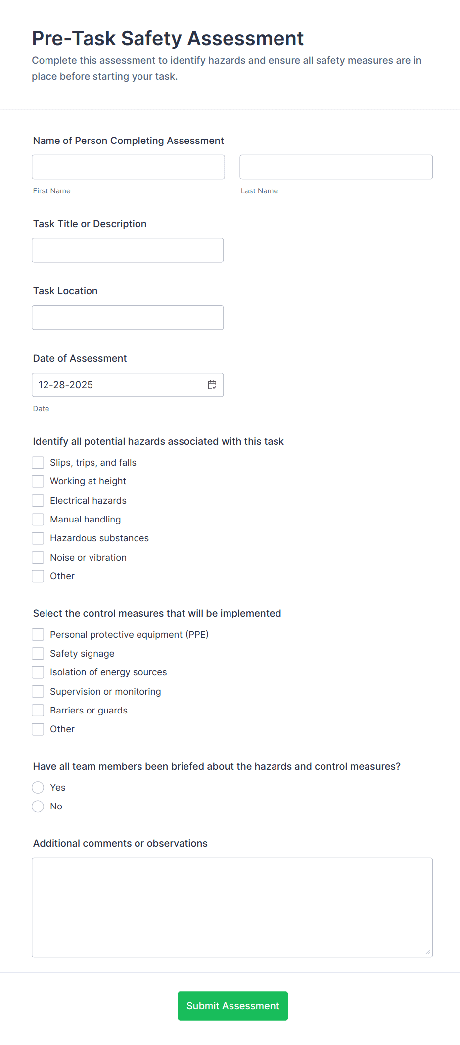• Conditional Logic: Some forms may use conditional fields to display additional questions based on previous answers (e.g., if a hazard is found, prompt for corrective action details).