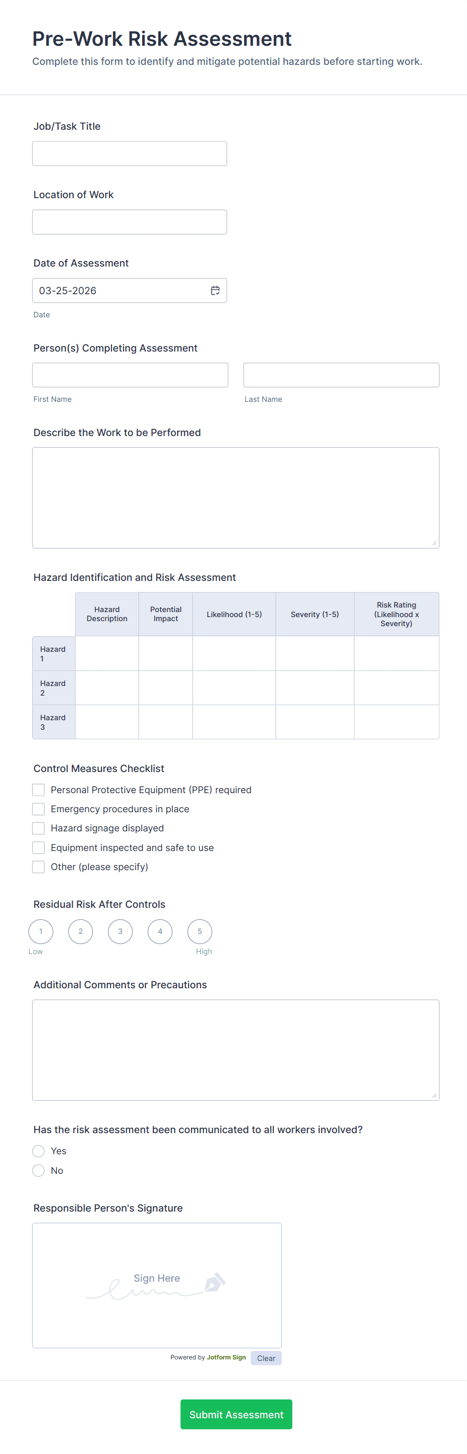 A Job Safety Analysis Form Template is a leading-edge tool for identifying and controlling workplace hazards. This form template aids managers in formulating preventative measures to reduce incidents, enhancing productivity and safety. Simplify your safety management process with Jotform.