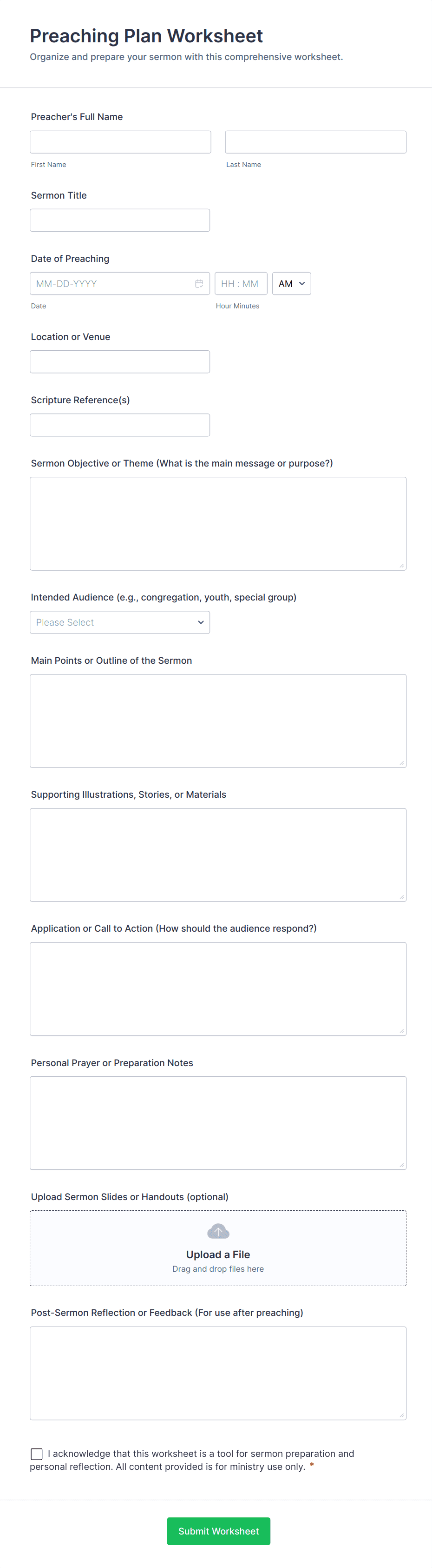 A church form template is a pre-designed online form that helps churches collect and manage information for various activities, such as event registrations, donations, volunteer sign-ups, and prayer requests.