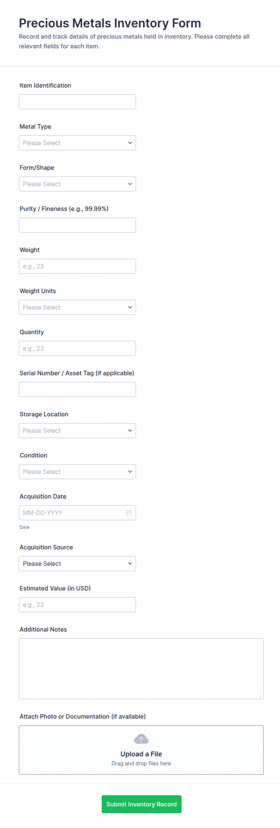 An Asset Tracking Form is a digital tool used to record, monitor, and manage information about physical or digital assets, such as equipment, inventory, or vehicles, throughout their lifecycle.