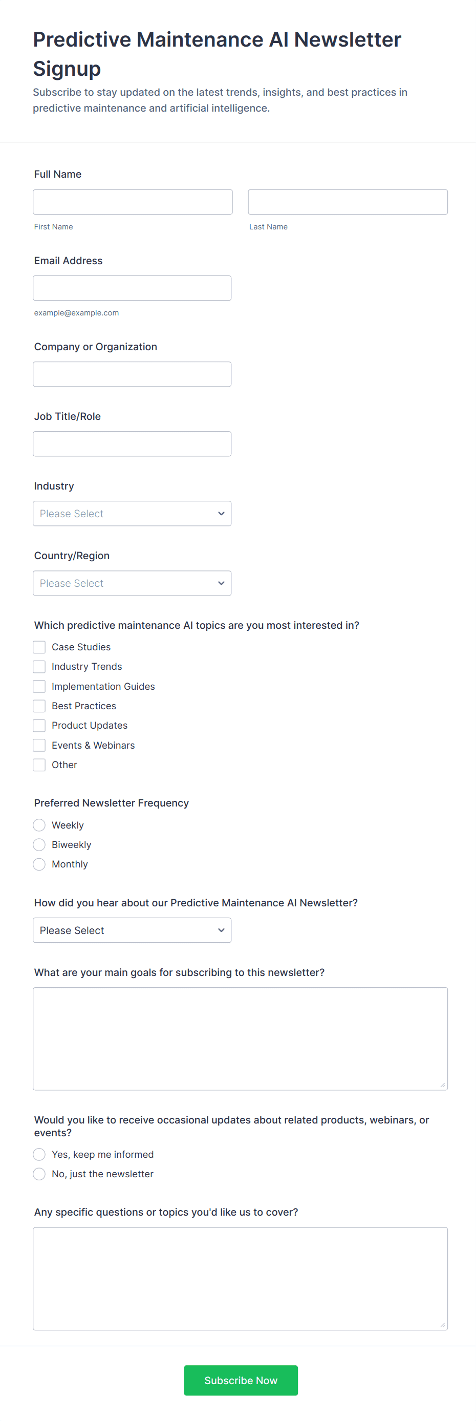 - Newsletter Sign Up: Typically requires only name and email, with optional interest checkboxes.