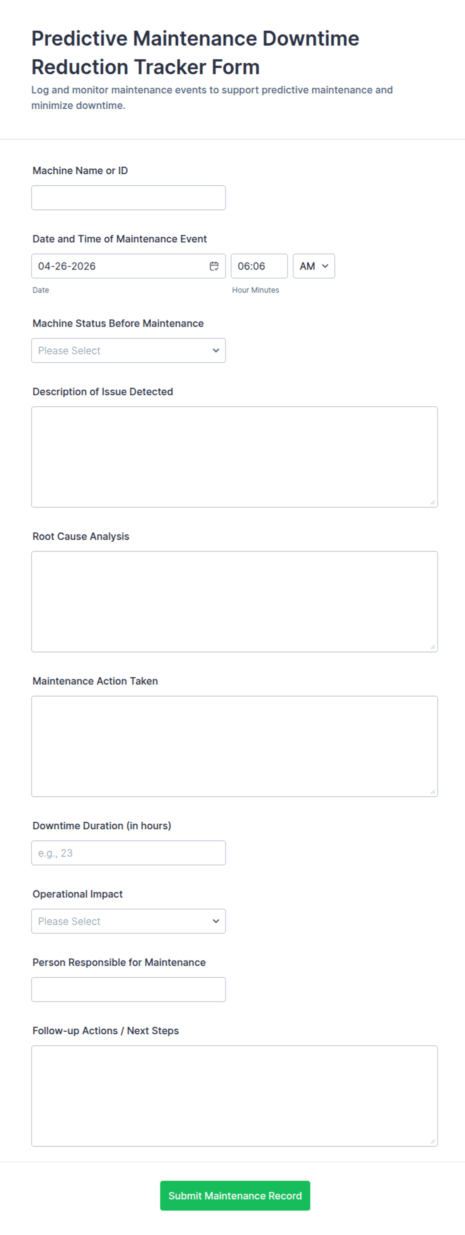 Track equipment upkeep with the Machine Maintenance Checklist Form for consistent data collection across sites, helping technicians and supervisors document inspections, replacements, and outcomes with every form submission in Jotform.