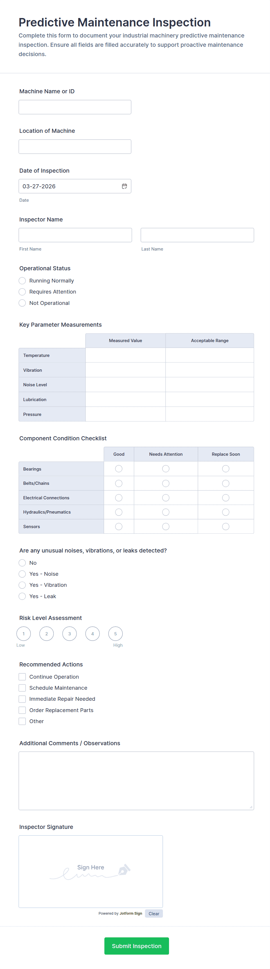 Track equipment upkeep with the Machine Maintenance Checklist Form for consistent data collection across sites, helping technicians and supervisors document inspections, replacements, and outcomes with every form submission in Jotform.