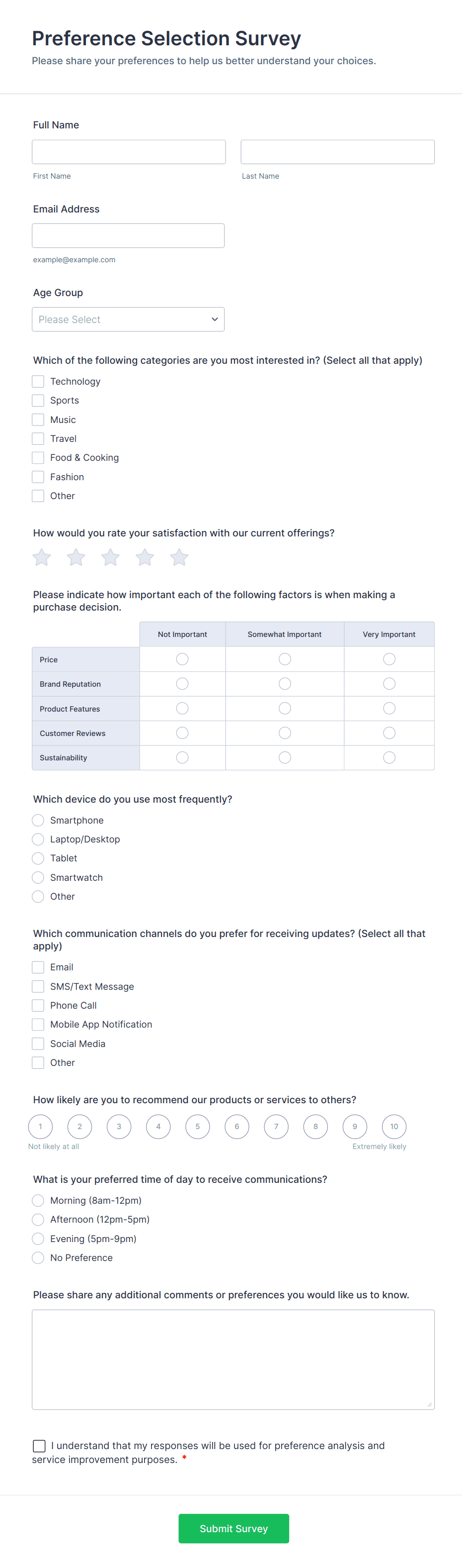 Product Survey Templates are pre-designed forms specifically created to help businesses, product managers, marketers, and researchers gather valuable feedback about products from customers, users, or stakeholders. These templates are used to assess customer satisfaction, collect suggestions for improvement, evaluate product features, and understand user experiences. Product survey forms can be utilized at various stages of a product’s lifecycle — from initial concept testing and beta launches to post-purchase feedback and ongoing product improvement. Common use cases include new product feedback, feature prioritization, usability testing, and post-launch satisfaction surveys.