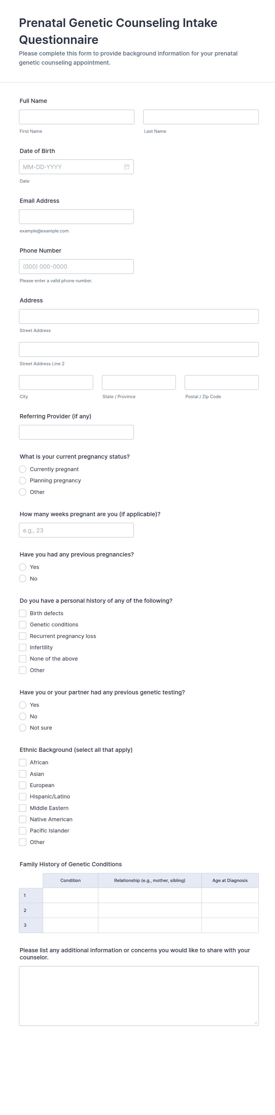 Intake forms are essential tools used to gather preliminary information from clients, patients, customers, or participants before providing a service or beginning a process. These forms streamline the onboarding process by collecting relevant details such as contact information, background data, preferences, and specific needs. Intake forms are widely used across various industries, including healthcare (patient intake), legal (client intake), education (student intake), human resources (employee onboarding), and service-based businesses (client consultations). By standardizing the information-gathering process, intake forms help organizations ensure consistency, improve efficiency, and deliver personalized experiences.