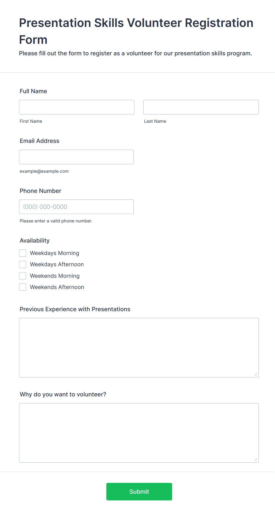 • Ongoing Program Enrollment: Nonprofits or community centers use forms to register volunteers for recurring programs, capturing long-term commitment and skill sets.