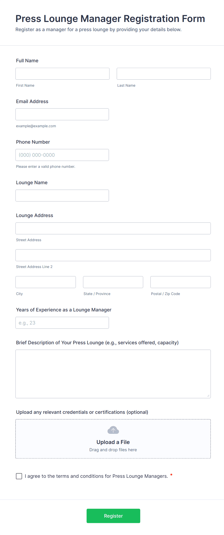 Event Registration Forms are digital tools designed to streamline the process of collecting attendee information for a wide variety of events, such as conferences, workshops, webinars, fundraisers, classes, and social gatherings. These forms allow organizers to gather essential details like participant names, contact information, payment preferences, dietary restrictions, and session selections. By using event registration forms, event planners can efficiently manage RSVPs, track attendance, and ensure a smooth check-in process on the day of the event. The flexibility of these forms makes them suitable for both small private gatherings and large-scale public events, adapting to the unique requirements of each occasion.
