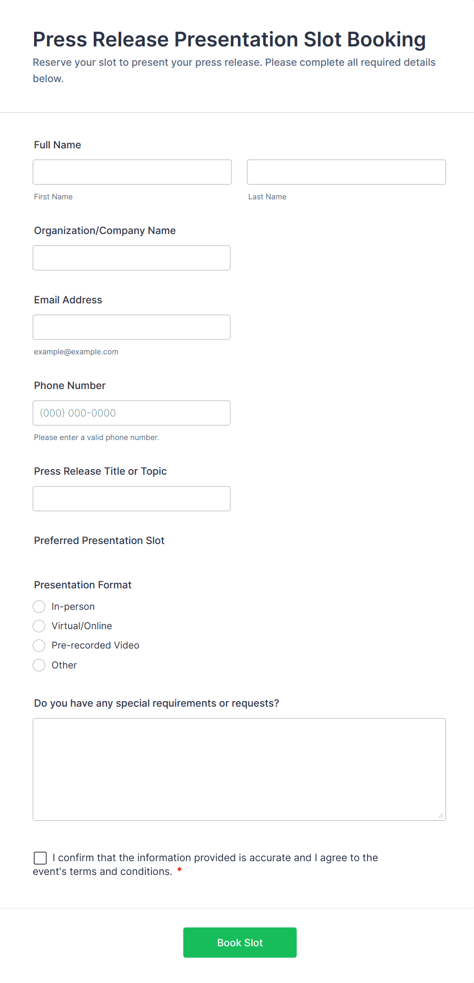 • Content and Fields: A concert booking form may require seat selection and payment integration, while a workshop sign-up might focus on participant details and session preferences. Private event RSVPs may include meal choices or guest information, whereas facility reservations could need date/time selectors and equipment checklists.