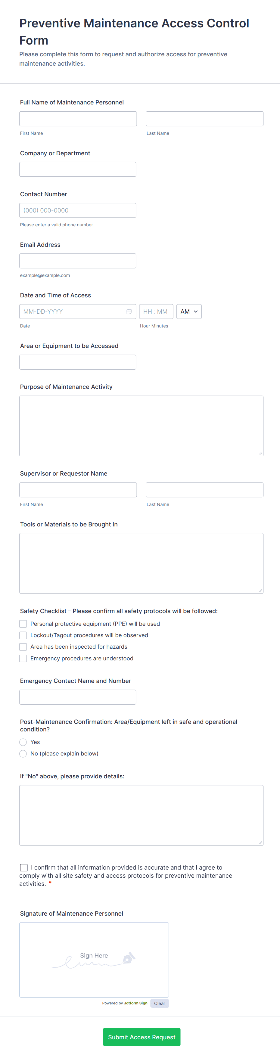 Access control forms are structured documents used to request, approve, and document access to physical locations, systems, or restricted resources. They help organizations manage who can enter certain areas, use specific equipment, or access sensitive digital systems by collecting consistent details such as requester identity, access level, justification, and approval records. Access control forms are commonly used in offices, campuses, data centers, hospitals, warehouses, and IT environments for badge requests, visitor access, temporary passes, role-based system access, and permission changes. By standardizing access requests, these forms reduce security risks, improve accountability, and create clear audit trails.