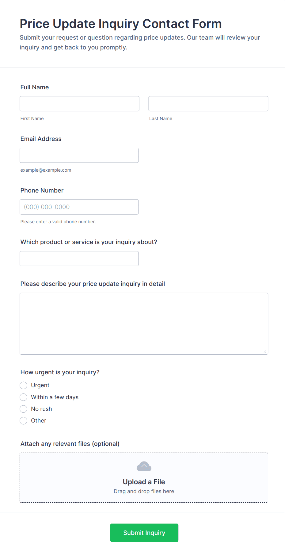 • For specialized use cases, include dropdowns (e.g., inquiry type), checkboxes (e.g., preferred contact method), or file upload fields (for attachments or screenshots).
