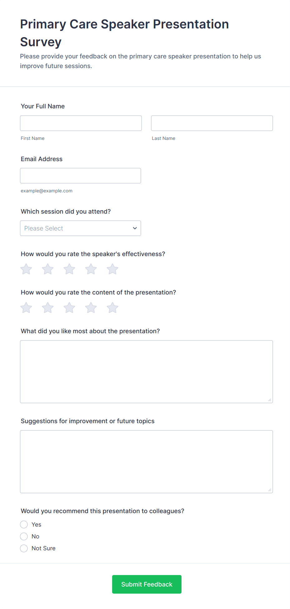 • Health-specific fields: Multiple choice for symptoms, rating scales for satisfaction, long text for open feedback.