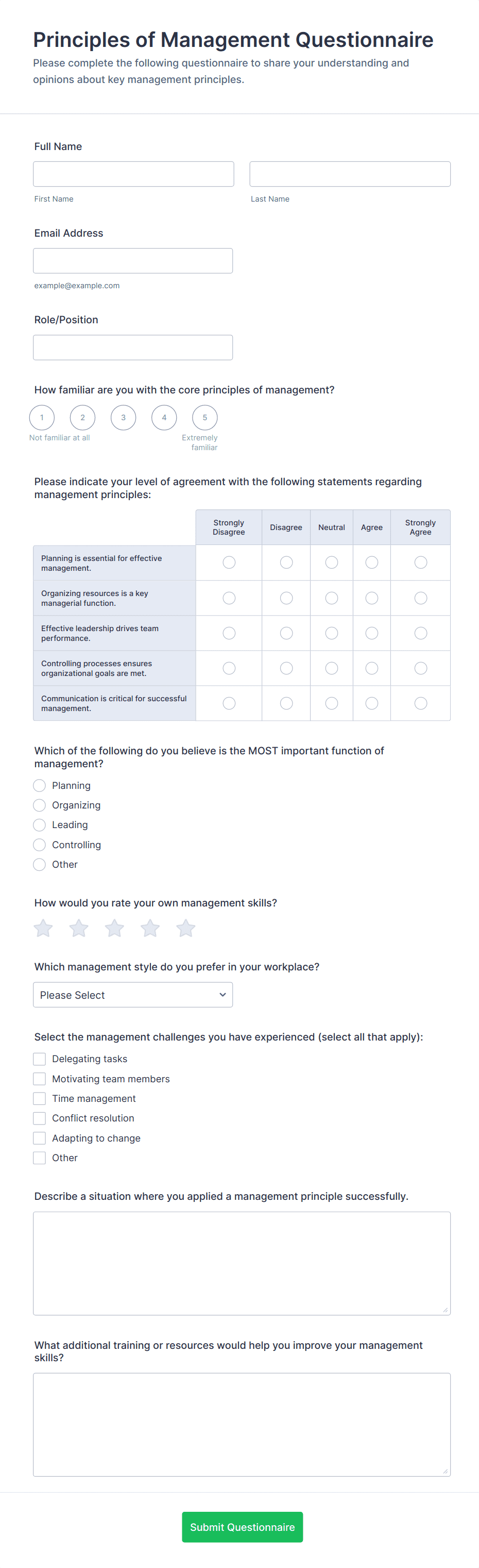 3. What information is typically included in a questionnaire template?