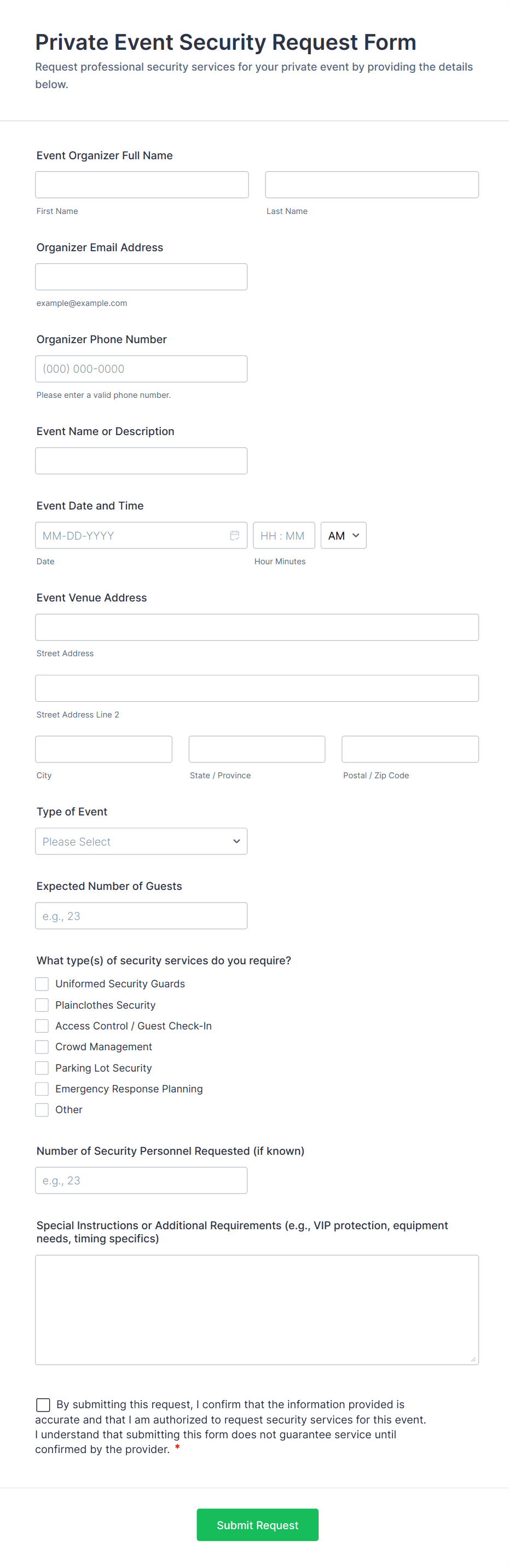 Event request forms are structured documents used to submit, review, and manage requests to plan or host an event. They help organizers collect consistent details like event purpose, dates, location needs, audience size, budget, and required services so events can be approved and coordinated efficiently. Event request forms are commonly used by companies, schools, nonprofits, venues, and community organizations for internal events, workshops, trainings, celebrations, marketing events, and public programs. By standardizing event requests, these forms reduce back-and-forth, improve planning accuracy, and create a clear record of event requirements from the start.