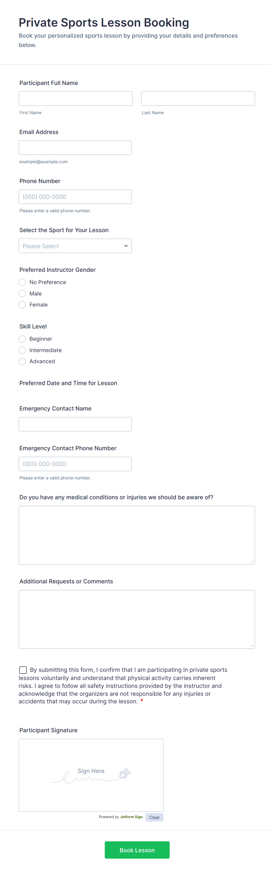 Booking forms are digital tools designed to streamline the process of scheduling appointments, reserving services, or booking resources. They are commonly used across a variety of industries, including hospitality, healthcare, education, event management, and personal services. Whether you’re managing hotel room reservations, client appointments, event registrations, or equipment rentals, booking forms help automate the intake of essential information, reduce manual errors, and ensure a smooth experience for both service providers and customers. Typical use cases include booking consultations, reserving meeting rooms, scheduling classes, or securing tickets for events.